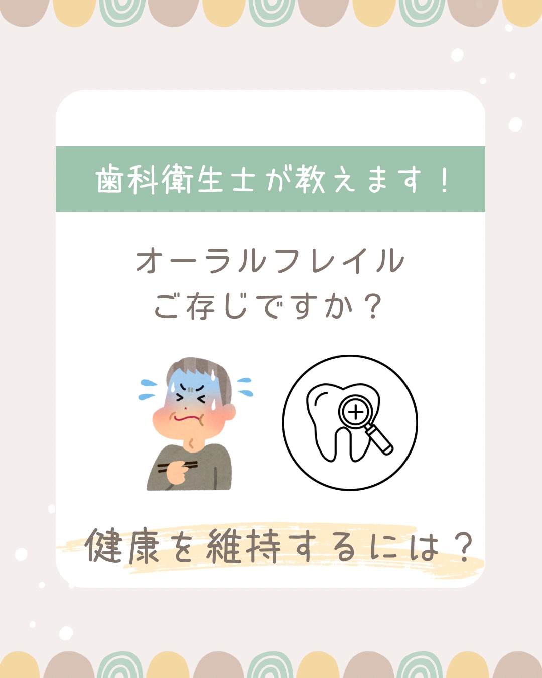 定期検診の際には、今回紹介した内容の改善ポイント以外でも1人1人に合わせた内容をお話することができます。少しでもお口の衰えを感じ始めた時は気軽に相談してくださいね♪