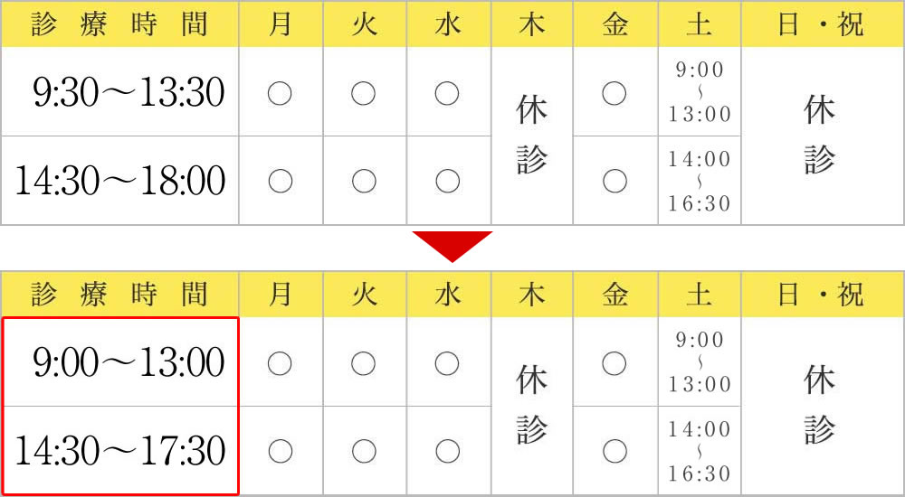 2021年(令和3年)10月より、平日の診療時間が下記のとおり変更となります。